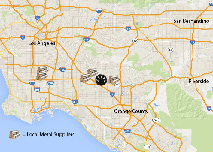 Atlas Metal Cutting has been serving the greater Los Angeles and Orange County areas for over 50 years. Our location is near the 5 and 91 intersection in Buena Park. We provide service to Los Angeles County, Orange County, San Bernardino County, Riverside County, San Diego County, and even out of state. See map below for Atlas Metal Cutting's location and proximity to multiple local metal suppliers.